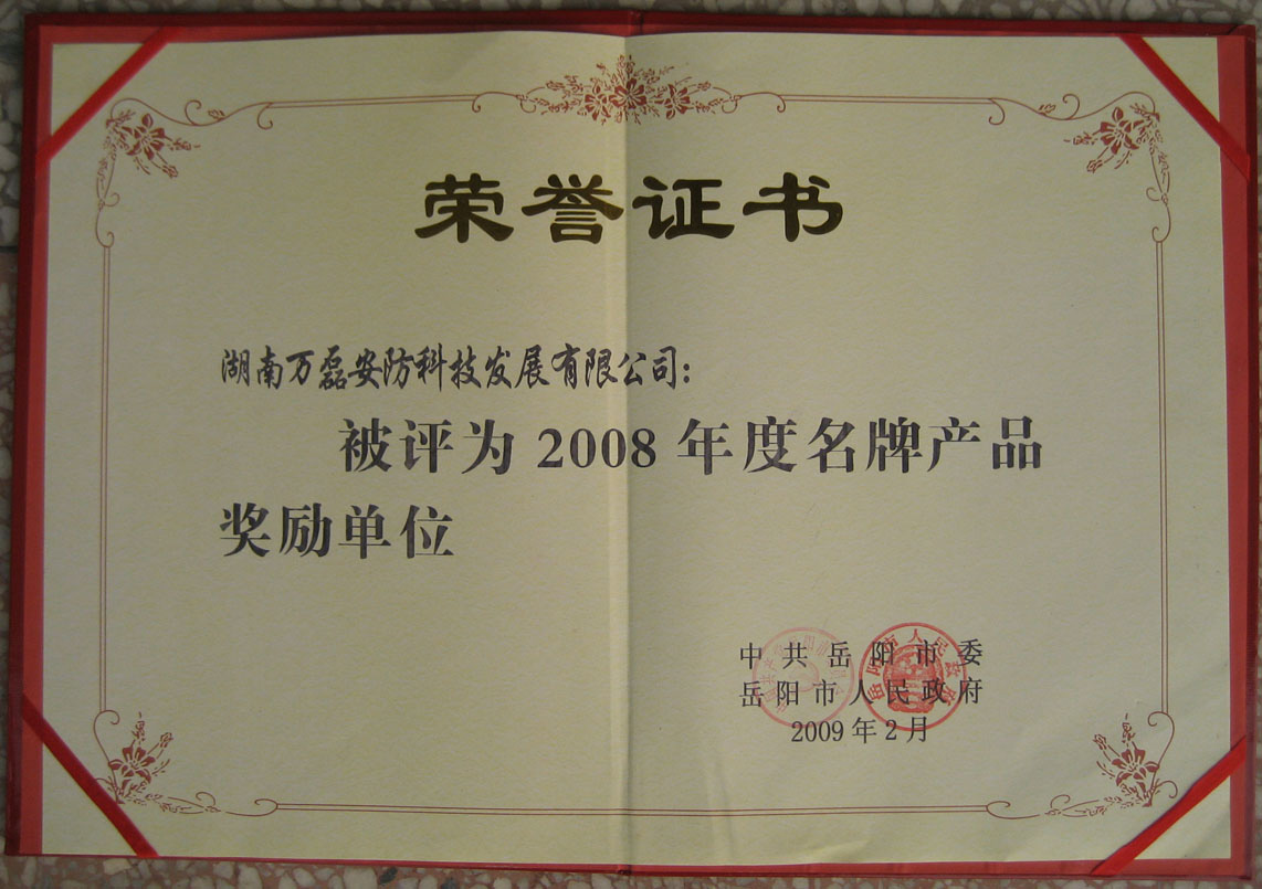 2008年岳陽(yáng)市名牌產(chǎn)品榮譽(yù)證書 |